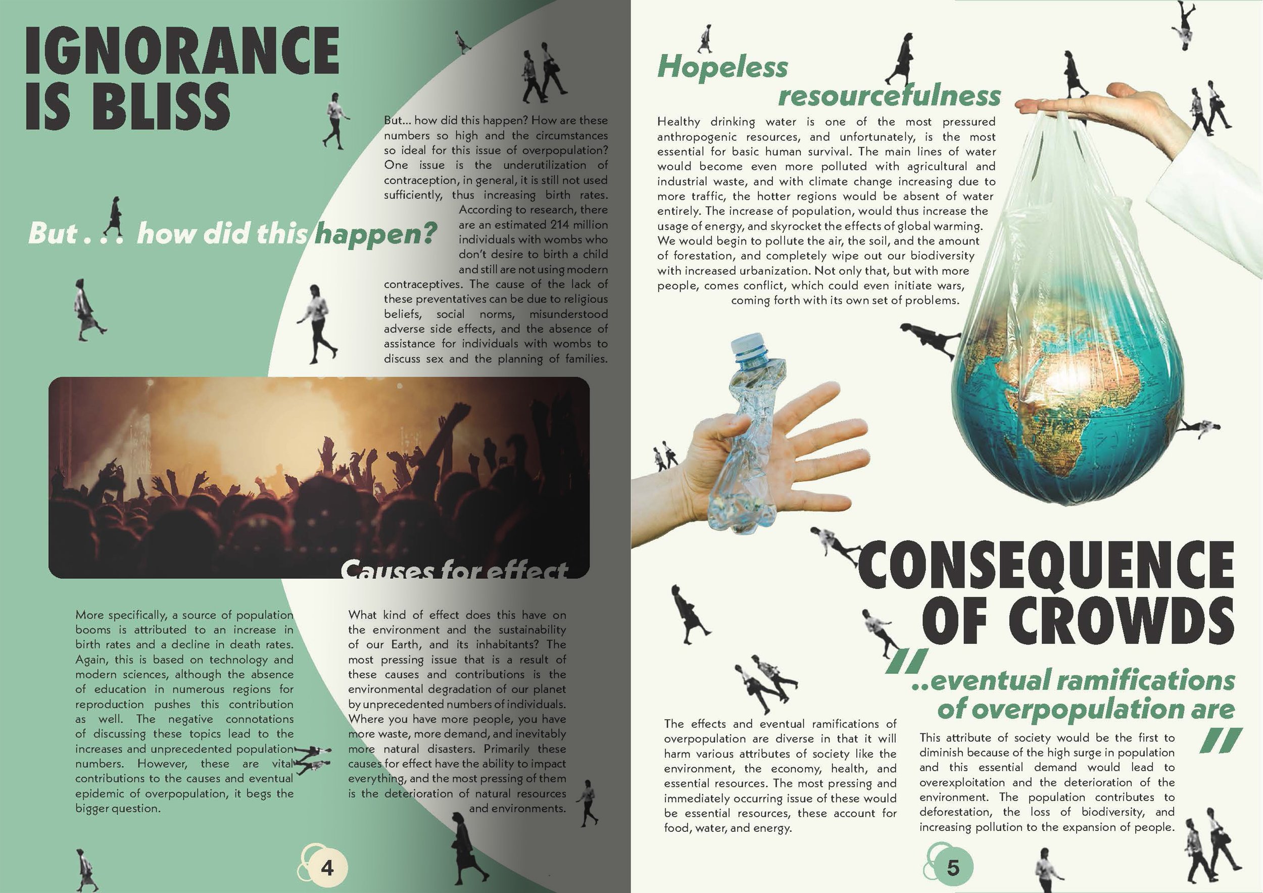 Creating a booklet with a subject not of my choosing, overpopulation, I had to carefully craft something that was legible and visually interesting with a difficult topic. One of those intricate requirements was to incorporate a “diecut,” which is a printing technique where shapes or designs are cut out of printed material. I chose the simplest shape, a circle, which goes through the cover and of course the first page which are indicated by the black circles, to reveal the crowded circular photo on page 3. As I strenuously researched overpopulation and its dangers, its believers and nonbelievers of the issue, and the threat of its arrival, I strove for this situation to not be overlooked. Unlike the individuals who question the validity of this environmental issue, I brought it to light with detailed paragraphs regarding the who, what, when, and where. Although paragraphs don’t particularly press the audience on the surface, I included elements to help illustrate this issue visually. I did this by increasing the stress of the reader by having an increasing number of people present as the pages progress. As well as a circle element to instill a feeling of impending doom, hence the severity of the issue.
